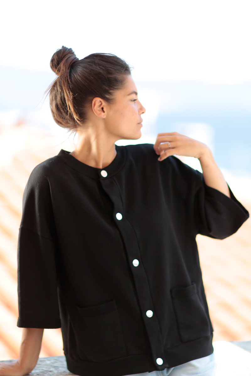 Cardigan en molleton . fermé par des pressions . 2 poches .Motif brillant au dos     toucher doux -lavé . . modèle déposé l