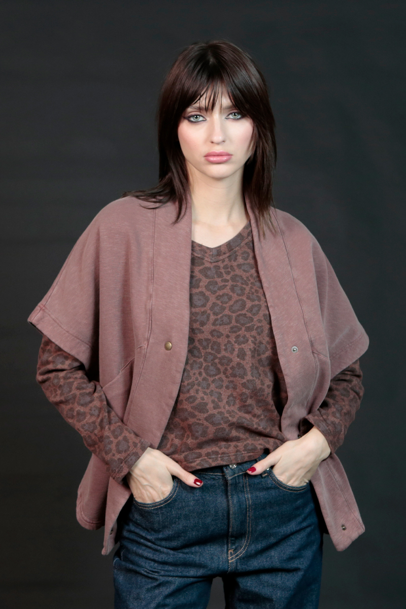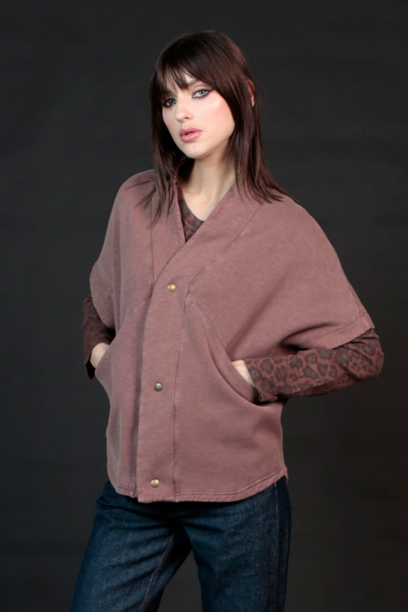 Gilet poncho en molleton épais toucher doux -lavé . Envers gratté. 2 poches fermetures par pressions . fit oversize. Composition: 100 % coton 380 grs